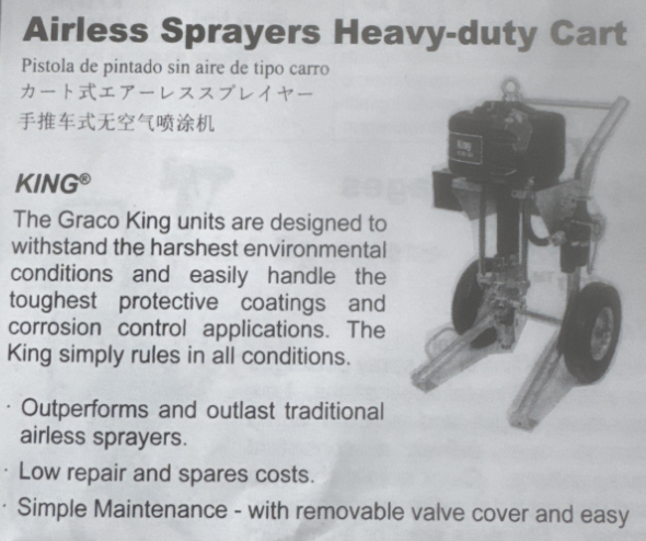 Airless Sprayers Heavy Duty Carts are designed to withstand the harshest environmental conditions and easily handle the toughest protective coatings and corrosion control applications. The King simply rules in all conditions.