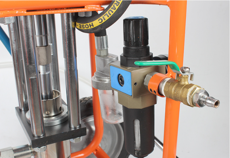 The spray gun does not require compressed air for atomization, but directly atomizes with the airless nozzle, so there is less waste of liquid material scattering. The liquid material is concentrated and scattered less, so the spraying efficiency is more than 2 times faster than ordinary air spraying. The main components of the airless spraying equipment include a liquid mixing barrel, a high-pressure delivery pump, a primary filter regulator and a secondary smoothing regulator, a high-pressure paint pipe, and an airless spray gun.